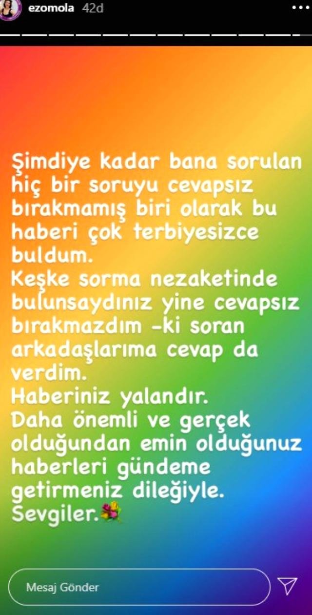 Kısa sürede gündem olan Ezgi Mola, sosyal medya hesabı Instagram’dan bir paylaşım yaparak hamilelik haberlerine açıklık getirdi. Sitemkar bir paylaşım yapan oyuncu şu ifadeleri kullandı: “Şimdiye kadar bana sorulan hiç bir soruyu cevapsız bırakmamış biri olarak bu haberi terbiyesizce buldum. Keşke sorma nezaketinde bulunsaydınız yine cevapsız bırakmazdım. Ki soran arkadaşlara cevap da verdim. Haberiniz yalandır. Daha gerçek ve emin olduğunuz haberleri gündeme getirmeniz dileğiyle. Sevgiler…”