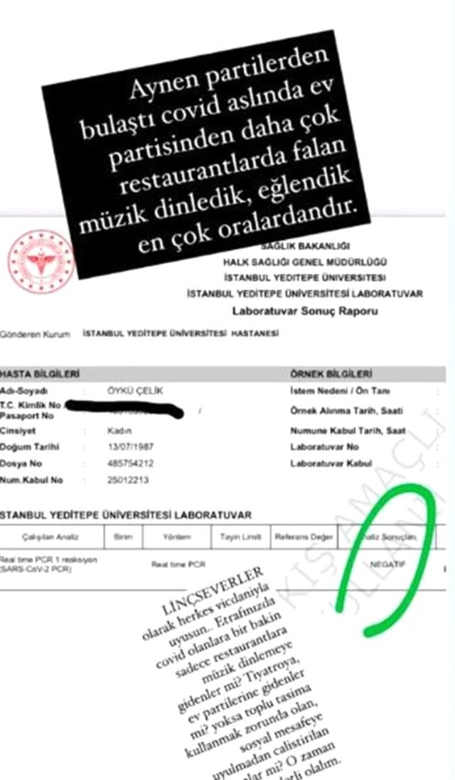 Çelik, test sonucunun üzerine “Linç severler olarak herkes vicdanıyla uyusun. Etrafınızda Kovid olanlara bakın; sadece restoranlara müzik dinlemeye gidenler mi yoksa toplu taşıma kullanmak zorunda olanlar mı?” notunu düştü.