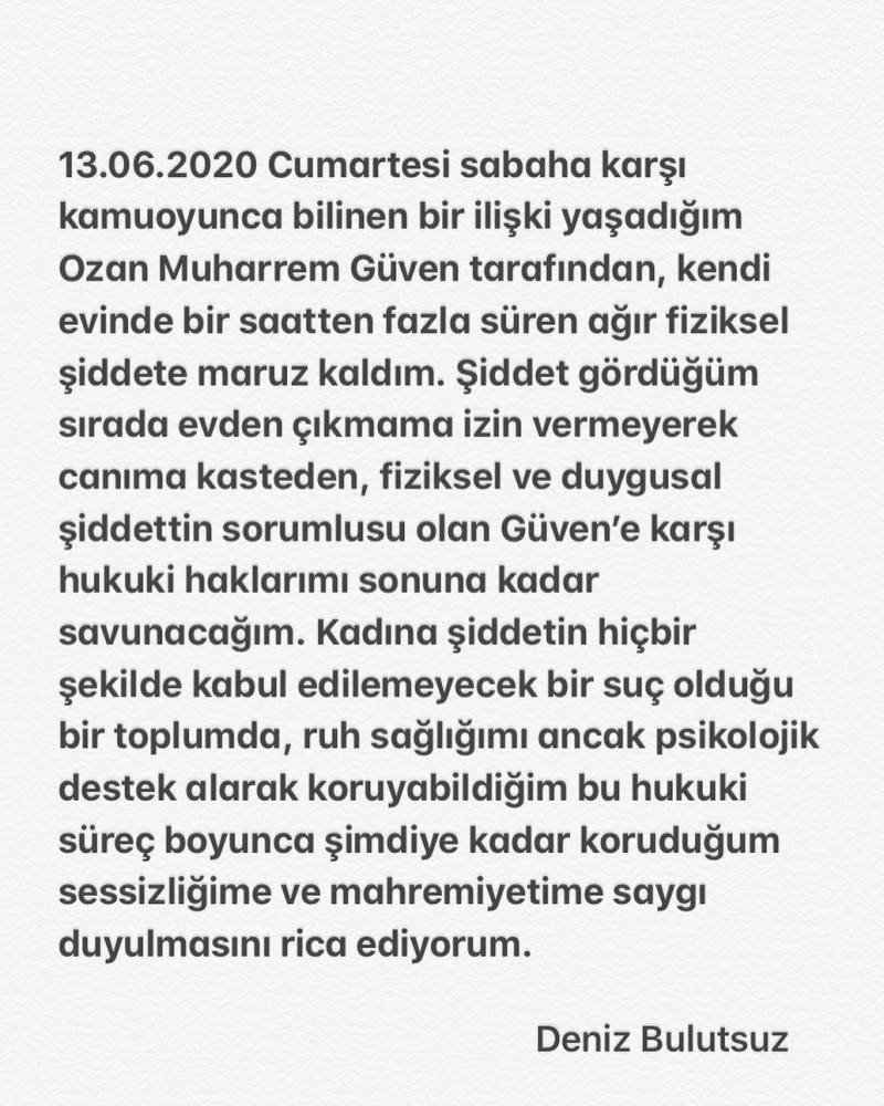 13 Haziran akşamı yaşanan olayda; Ozan Güven’in evinde olduğu Deniz Bulutsuz, eski arkadaşlık muhabbetlerinden rahatsız olduğunu bildirdikten sonra fiziksel ve psikolojik şiddete maruz kaldığını bildirerek polise başvurdu.
