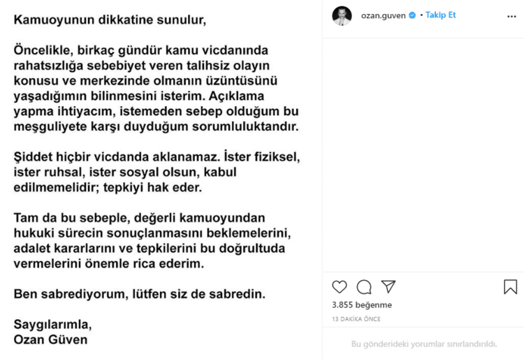 Ozan Güven’in açıklaması şöyle:Kamuoyunun dikkatine sunulur,Öncelikle, birkaç gündür kamu vicdanında rahatsızlığa sebebiyet veren olayın konusu ve merkezinde olmanın üzüntüsünü yaşadığımın bilinmesini isterim.Açıklama yapma ihtiyacım, istemeden sebep olduğum bu meşguliyete karşı duyduğum sorumluluktandır.Şiddet hiçbir vicdanda aklanmaz. İster fiziksel, ister ruhsal, ister sosyal olsun, kabul edilmemelidir; tepkiyi hak eder.Tam da bu sebeple, değerli kamuoyundan hukuki sürecin sonuçlanmasını beklemelerini, adalet kararlarını ve tepkilerini bu doğrultuda vermelerini önemle rica ederim.Ben sabrediyorum, lütfen siz de sabredin.Saygılarımla,Ozan Güven