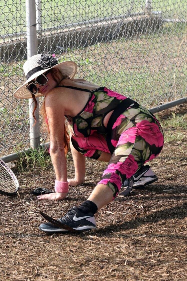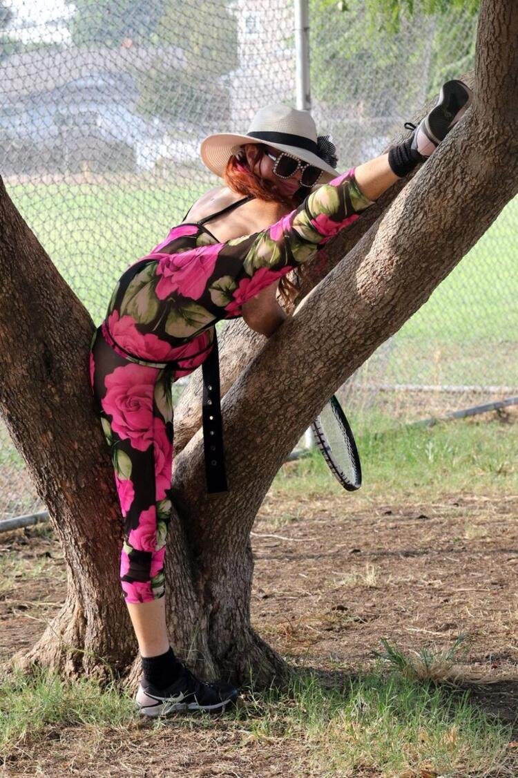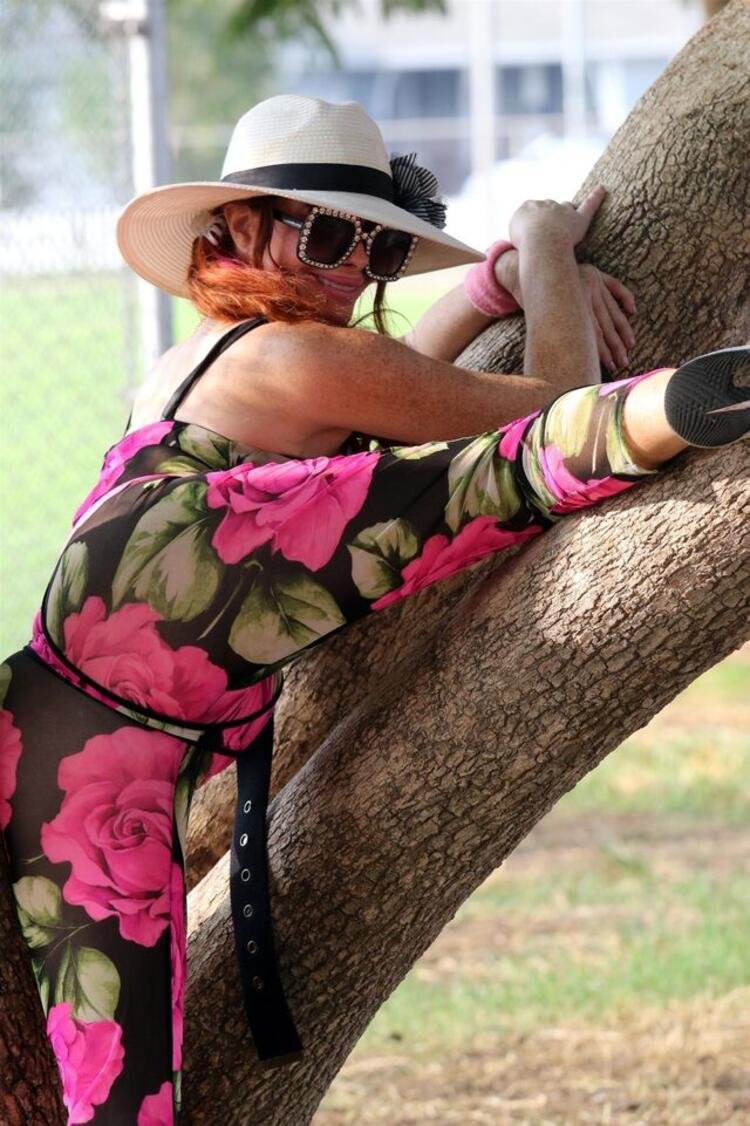 Siyah üzerine pembe güllerle bezeli tulumla ağaç üzerinde esneme hareketi yapan Phoebe Price , paparazzilerin dikkatini çekmek için elinden geleni yaptı.