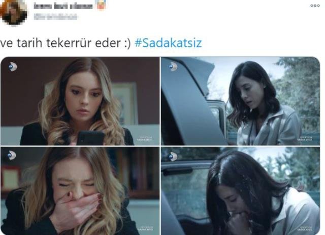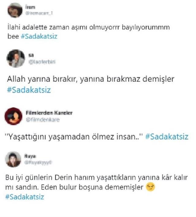 Sadakatsiz dizisinin 2. bölümde Asya, eşi Volkan’ın kendisini aldattığında şüphelenip arabasını karıştırmış ve bagaja gizlenmiş bir telefon bulmuştu. Volkan ve Asya’nın evliliğini bozan Derin’in aynı şeyleri yaşaması sosyal medyada büyük yankı uyandırdı. Sosyal medya kullanıcıları Derin için “Tarih tekerrürden ibaret. Yaşattığını mutlaka yaşarsın” diye paylaşımlar yapıldı.