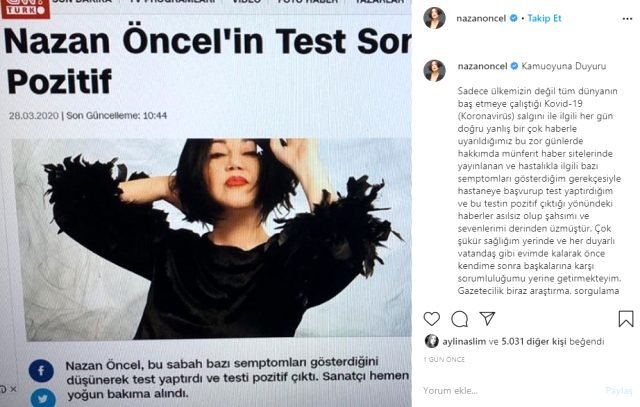 Hakkında çıkan haberlere Instagram hesabından cevap veren Nazan Öncel şunları söyledi: “Haberler asılsız olup, şahsımı ve sevenlerimi derinden üzmüştür. Çok şükür sağlığım yerinde ve her duyarlı vatandaş gibi evimde kalarak, başkalarına karşı sorumluluğumu yerine getirmekteyim. Sadece ülkemizin değil tüm dünyanın baş etmeye çalıştığı Kovid-19 (Koronavirüs) salgını ile ilgili her gün doğru yanlış bir çok haberle uyarıldığımız bu zor günlerde hakkımda münferit haber sitelerinde yayınlanan ve hastalıkla ilgili bazı semptomları gösterdiğim gerekçesiyle hastaneye başvurup test yaptırdığım ve bu testin pozitif çıktığı yönündeki haberler asılsız olup şahsımı ve sevenlerimi derinden üzmüştür. Çok şükür sağlığım yerinde ve her duyarlı vatandaş gibi evimde kalarak önce kendime sonra başkalarına karşı sorumluluğumu yerine getirmekteyim.”