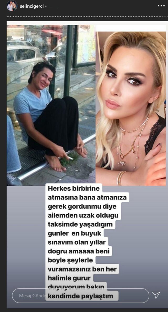 Selin Ciğerci, dün gün içinde, yıllar önce çekilen bir fotoğrafının sosyal medyada sık sık paylaşılmasının ardından kendi hesabından bir açıklama yaptı ve “Herkes birbirine atmasına, bana atmanıza gerek yok. ‘Gördün mü?’ diye. Ailemden uzak olduğum, Taksim’de yaşadığım günler. En büyük sınavım olan yıllar. Doğru ama beni böyle şeylerle vuramazsınız. Ben her halimle gurur duyuyorum. Bakın kendim de paylaştım” dedi…