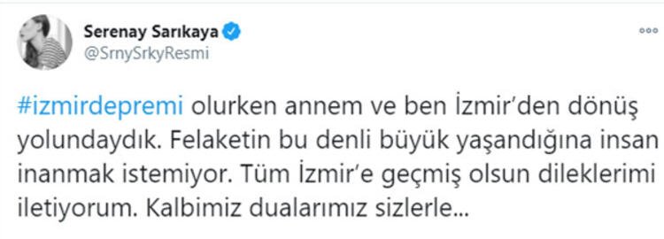 Sarıkaya, “Tüm İzmir’e geçmiş olsun dileklerimi iletiyorum. Kalbimiz dualarımız sizlerle” mesajını yayınladı.