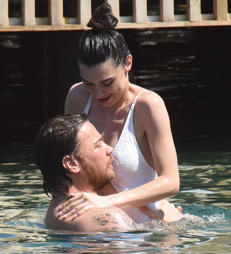 Güzel oyuncu, denizde Sinan Akçıl’ı öpmeye doyamadı.