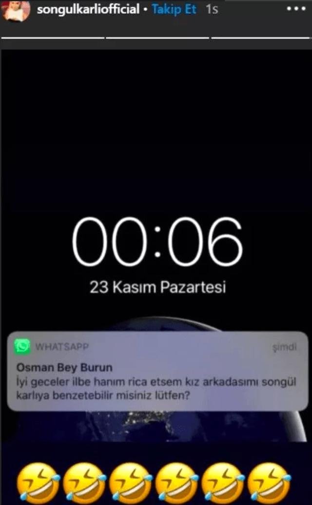 Songül Karlı’nın paylaştığı mesajda “İyi geceler İlbe Hanım rica etsem kız arkadaşımı Songül Karlı’ya benzetebilir misiniz lütfen” ifadeleri yer aldı.
