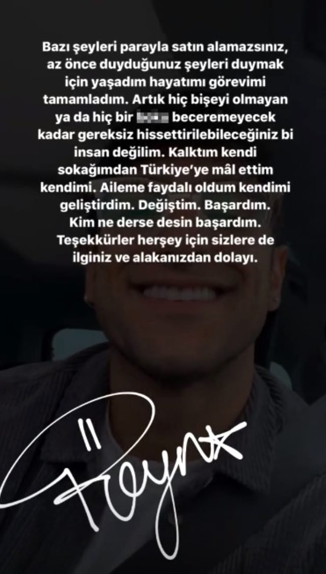 Reynmen ise “Bazı şeyleri parayla satın alamazsınız. Az önce duyduğunuz şeyleri duymak İçin yaşadım hayatımı… Görevimi tamamladım. Artık hiçbir şeyi olmayan, hiçbir b.ku beceremeyecek kadar gereksiz hissettirebileceğiniz bir insan değilim. Kalktım kendi sokağımdan, Türkiye’ye mal ettim kendimi. Aileme faydalı oldum, kendimi geliştirdim. Değiştim, başardım. Kim ne derse desin!” dedi.