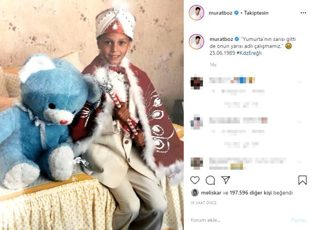 Evde eski albümlere bakan yakışıklı şarkıcı, sünnet düğününde çekilen bir fotoğrafını takipçileriyle paylaşarak “Yumurtanın sarısı gitti de onun yarısı adlı çalışmamız 25.06.1989” ifadelerini kullandı. Boz’un fotoğrafı kısa sürede 197 bin kişi tarafından beğenildi.