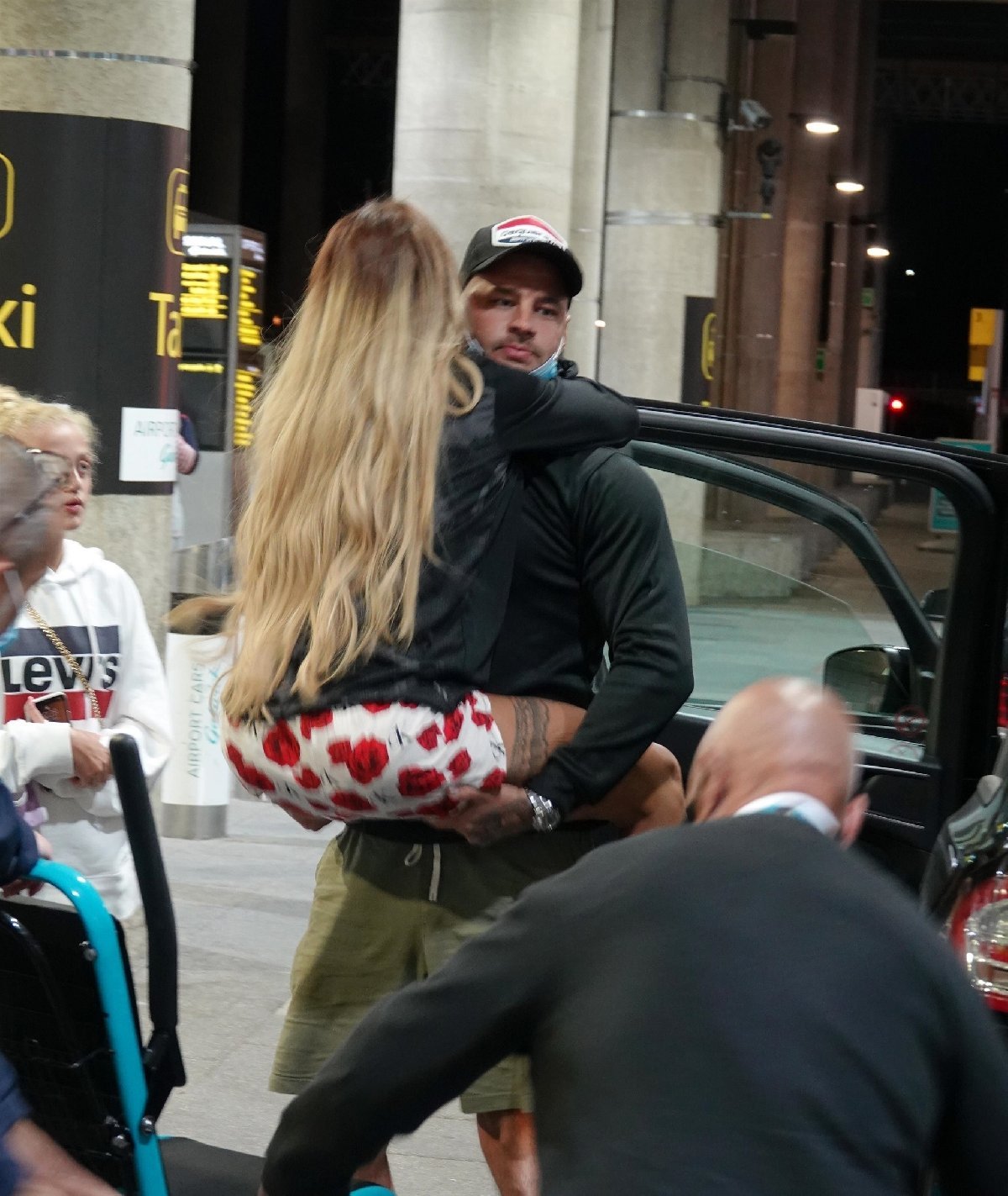 İki bacağı da alçıda olan Price’ı, özel araçtan tekerlekli sandalyeye sevgilisi Woods, kucağına alarak taşıdı. Havaalanı görevlisi tekerlekli sandalyeyi iterken, Carl Woods da Price’ın elini tuttu.