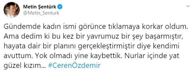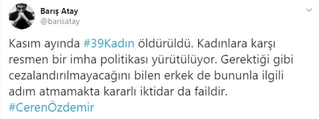 “Şule Özge için; Ceren Gülenay için tweet atıyor! Ardından katlediliyor! Ve döngü böyle devam ediyor, devran böyle dönüyor! Gencecik kızlarımız, koca koca kadınlarımız ölümü bekliyor sadece bugün de ölmediği için şükrederek!”