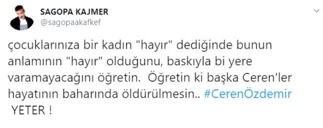 “Çocuklarınıza bir kadın ‘hayır’ dediğinde bunun anlamının ‘hayır’ olduğunu, baskıyla bir yere varamayacağını öğretin. öğretin ki başka Ceren’ler hayatının baharında öldürülmesin. Yeter!”