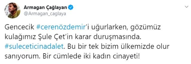 “Gencecik Ceren Özdemir’i uğurlarken, gözümüz kulağımız Şule Çet’in karar duruşmasında. Şule Çet için adalet. Bu bir tek bizim ülkemizde olur sanıyorum. Bir cümlede iki kadın cinayeti!”