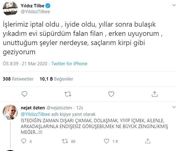 Virüs sebebiyle tüm işleri iptal olan sevilen şarkıcı Yıldız Tilbe, evde durmanın pozitif yanlarını söyledi. Twitter hesabını aktif olarak kullanan Tilbe attığı tweette, “İşlerimiz iptal oldu, iyi de oldu. Yıllar sonra bulaşık yıkadım, evi süpürdüm. Saçlarım kirpi gibi geziyorum” notunu düştü.