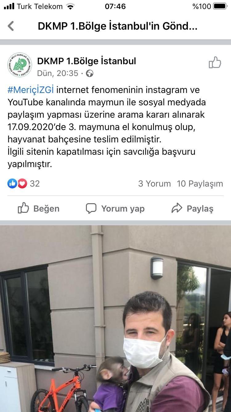 Sosyal medya fenomeni Meriç İzgi, bu ay içinde bir kez daha yasa dışı yollarla maymun aldı. 3’üncü kez aldığı maymunla olan fotoğraflarını sosyal medya üzerinden paylaşması sonucunda Doğa Koruma ve Milli Parklar (DKMP) 1. Bölge Müdürlüğü ekipleri ile İstanbul Emniyet Müdürlüğü Kaçakçılık Suçlarıyla Mücadele Şube Müdürlüğü ekipleri harekete geçti. Arama kararı alınarak dün İzgi’nin Sarıyer’deki evine gelen ekipler, ‘Makak’ cinsi maymuna el koydu.