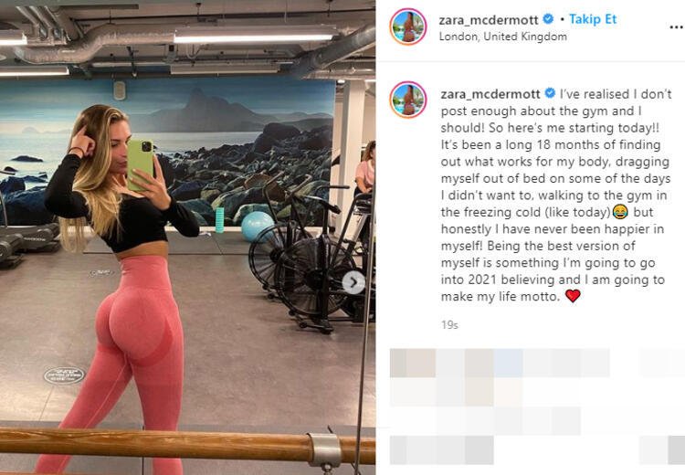 Geçtiğimiz ay turuncu taytıyla ayna önünde poz veren 23 yaşındaki Zara McDermott olay olmuştu. McDermott paylaşımına “Spor salonu hakkında yeterince gönderi paylaşmadığımı fark ettim ve hemen yapmalıyım! İşte bugün başlıyorum” notunu düşmüştü.