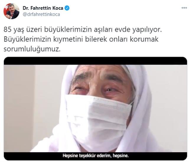 Bakan Koca, Twitter hesabındaki paylaşımında, Kovid-19 aşıları evlerinde yapılan 85 yaş ve üstündeki vatandaşlara ilişkin, “85 yaş üzeri büyüklerimizin aşıları evde yapılıyor. Büyüklerimizin kıymetini bilerek onları korumak sorumluluğumuz” değerlendirmesinde bulundu.