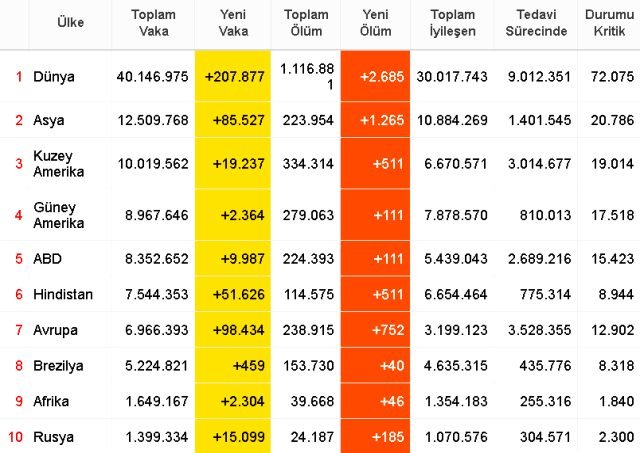 18 EKİM 2020 PAZAR DÜNYA KORONAVİRÜS TABLOSU