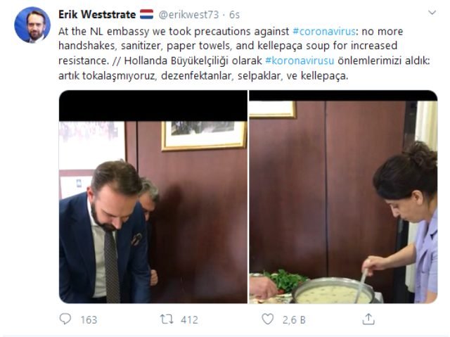 Hollanda’nın Ankara Büyükelçi Yardımcısı Erik Weststrate, Twitter hesabından yaptığı paylaşımda “Hollanda Büyükelçiliği olarak #koronavirus önlemlerimizi aldık: Artık tokalaşmıyoruz, dezenfektanlar, selpaklar ve kelle paça” ifadelerine yer verdi.