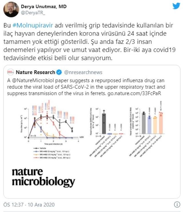 ABD’de Jackson Laboratuvarı Enstitüsü’nde Baş Araştırmacı olarak çalışan Prof. Dr. Derya Unutmaz, “Bu Molnupiravir adı verilen grip tedavisinde kullanılan ilacın hayvan deneylerinde korona virüsünü 24 saat içinde tamamen yok ettiği gösterildi. Şu anda faz 2/3 insan denemeleri yapılıyor ve umut vaat ediyor. Bir-iki aya korona tedavisinde etkisi belli olur sanıyorum” ifadelerini kullandı.