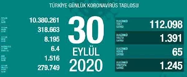 SAĞLIK Bakanı Fahrettin Koca, son 24 saatte yapılan 112 bin 98 testten 1391 koronavirüs hastası tespit edildiğini, virüs nedeniyle hayatını kaybeden 65 kişi ile toplam can kaybının 8 bin 195 olduğunu açıkladı.