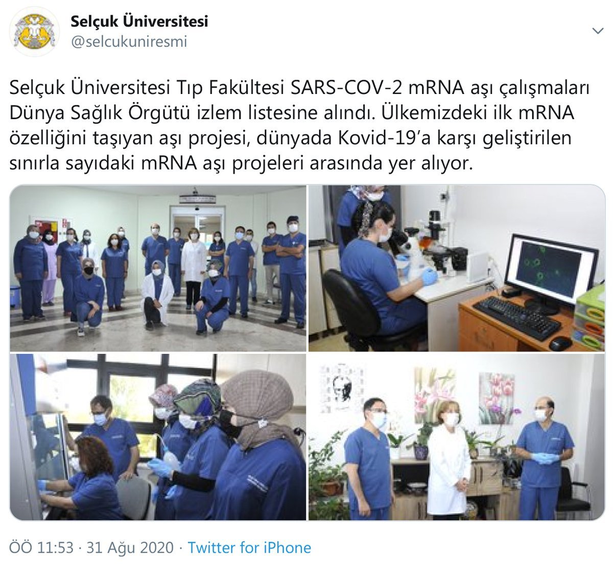 * Selçuk Üniversitesinden de iki aşı projesi bu listeye dâhil oldu. Çalışmakta olduğumuz aşı projemiz de Dünya Sağlık Örgütü’nün izlem listesindedir.
