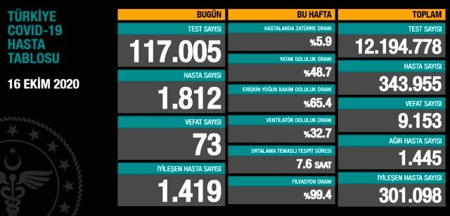 Sağlık Bakanlığı, Türkiye‘nin Günlük Koronavirüs Tablosu’nu paylaştı. 16 Ekim‘de açıklanan son 24 saatlik verilere göre; 1812 yeni vaka tespit edildi, vefat sayısı ise 73 olarak gerçekleşti. Böylece Türkiye’de koronavirüs nedeniyle hayatını kaybedenlerin sayısı 9 bin 153’e, toplam vaka sayısı ise 343 bin 955’e yükseldi.
