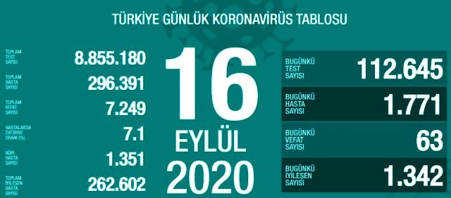 Sağlık Bakanı Fahrettin Koca, Bilim Kurulu toplantısında, Türkiye‘nin Günlük Koronavirüs Tablosu’nu paylaştı. 16 Eylül‘de açıklanan son 24 saatlik verilere göre; 1771 yeni vaka tespit edildi, vefat sayısı ise 63 olarak gerçekleşti. Böylece Türkiye’de koronavirüs nedeniyle hayatını kaybedenlerin sayısı 7 bin 249’a, toplam vaka sayısı ise 296 bin 391’e yükseldi.