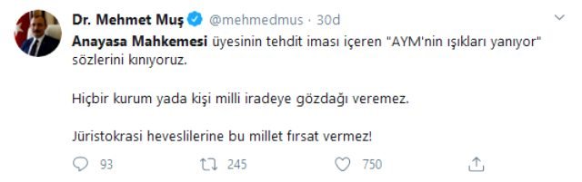 AK Parti Grup Başkanvekili Mehmet Muş ise sosyal medya hesabı üzerinden yaptığı açıklamada, “Anayasa Mahkemesi üyesinin tehdit iması içeren “AYM’nin ışıkları yanıyor” sözlerini kınıyoruz. Hiçbir kurum yada kişi milli iradeye gözdağı veremez. Jüristokrasi heveslilerine bu millet fırsat vermez!” ifadelerini kullandı.