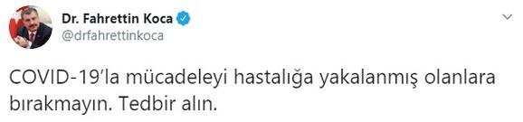 Bakan Koca, paylaşımında, “Covid-19’la mücadeleyi hastalığa yakalanmış olanlara bırakmayın. Tedbir alın” dedi.
