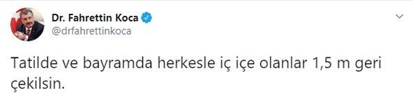 Öte yandan Bakan Koca sosyal medya hesabından bir paylaşım daha yaparak, ‘Tatilde ve bayramda herkesle iç içe olanlar 1,5 m geri çekilsin’ ifadelerine yer verdi.