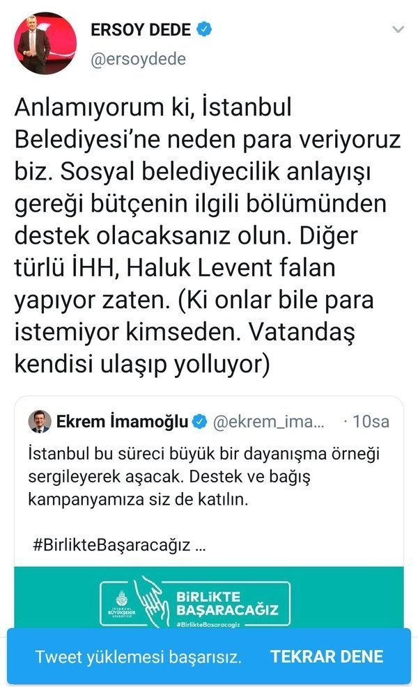 Star yazarı Ersoy Dede, İstanbul Büyükşehir Belediye Başkanı Ekrem İmamoğlu’nun duyurduğu koronavirüsle mücadele için başlatılan bağış kampanyasını sosyal medya hesabından eleştirdi.
