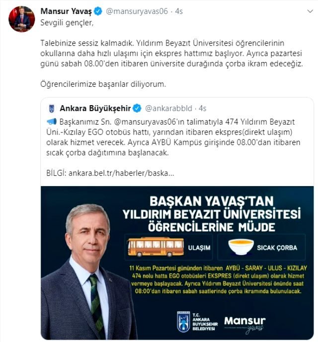 Mansur Yavaş Twitter hesabından yaptığı paylaşımda, “Sevgili gençler, Talebinize sessiz kalmadık. Yıldırım Beyazıt Üniversitesi öğrencilerinin okullarına daha hızlı ulaşımı için ekspres hattımız başlıyor. Ayrıca pazartesi günü sabah 08.00’den itibaren üniversite durağında çorba ikram edeceğiz. Öğrencilerimize başarılar diliyorum.” ifadelerini kullandı.