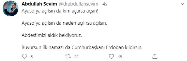 “Ayasofya açılsın da kim açarsa açsın! Ayasofya açılsın da neden açılırsa açılsın. Abdestimizi aldık bekliyoruz. Buyursun ilk namazı da Cumhurbaşkanı Erdoğan kıldırsın.”