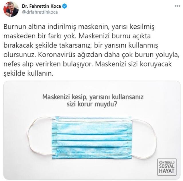 Burnun altına indirilmiş maskenin, yarısı kesilmiş maskeden bir farkı yok. Maskenizi burnu açıkta bırakacak şekilde takarsanız, bir yarısını kullanmış olursunuz. Koronavirüs ağızdan daha çok burun yoluyla, nefes alıp verirken bulaşıyor. Maskenizi sizi koruyacak şekilde kullanın.