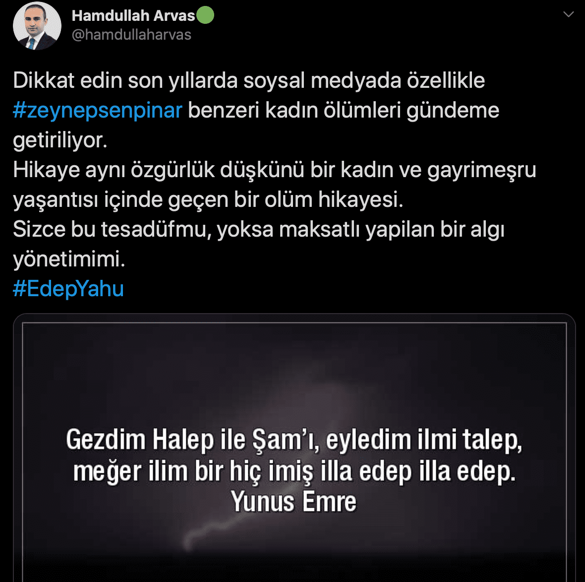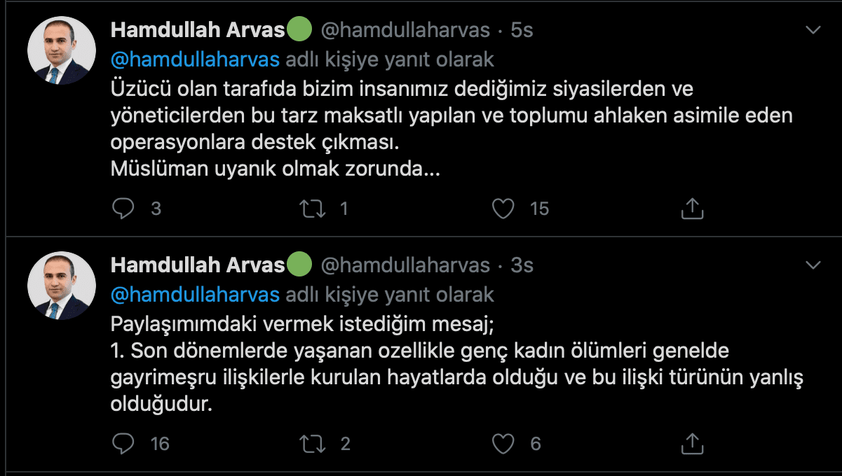 Zeynep Şenpınar’ın öldürülme sebebinin kişisel yaşantısı olduğunu iddia eden Arvas, sosyal medya hesabı üzerinden yaptığı paylaşımda, “Dikkat edin son yıllarda soysal medyada özellikle Zeynep Şenpınar benzeri kadın ölümleri gündeme getiriliyor. Hikaye ayn; özgürlük düşkünü bir kadın ve gayrimeşru yaşantısı içinde geçen bir ölüm hikayesi. Sizce bu tesadüf mü, yoksa maksatlı yapılan bir algı yönetimi mi? Edep yahu” demişti.