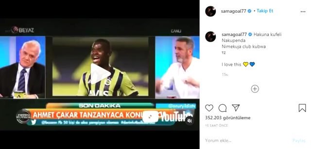 Eski hakem ve futbol yorumcusu Ahmet Çakar‘ın geçtiğimiz günlerde Beyaz Futbol’da kendisine Svahili dilinde söylediği “Hakuna kufeli. Nakupenda. Nimekuja club kubwa” (Başarısızlık yok. Seni seviyorum. Harika bir kulübe geldim) sözlerinin videosunu paylaşan Samatta, “Bunu sevdim” mesajını yazdı.