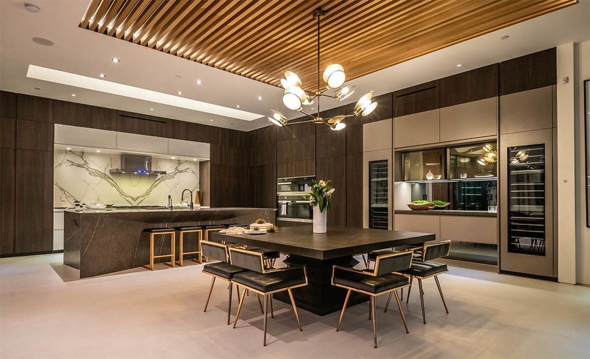 Salonda bir şömine bulunduğu belirtilirken evin içerisinde ayrı bir bar yer alıyor. Bar içerisinde iki adet mini buzdolabı, şarap rafı ve bulaşık makinesi bulunuyor. Mutfağın bazı noktalarında da özel bir tasarımcı tarafından geliştirilen paslanmaz çelik kullanıldığı belirtilirken zeminden-tavana kayan cam kapılar sayesinde manzaranın evin her yerinden görüldüğü vurgulanıyor.
