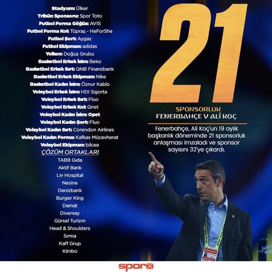 Şu an 32 farklı sponsoru bulunan Fenerbahçe, bu sponsorların 21’ini Ali Koç döneminde buldu. Mazbatayı almasından bu yana 19 ay geçen Ali Koç, 583 günde 21 sponsorluk veya çözüm ortaklığı imzası atarak ortalama 27 günde bir Fenerbahçe’ye sponsor kazandırmış oldu.