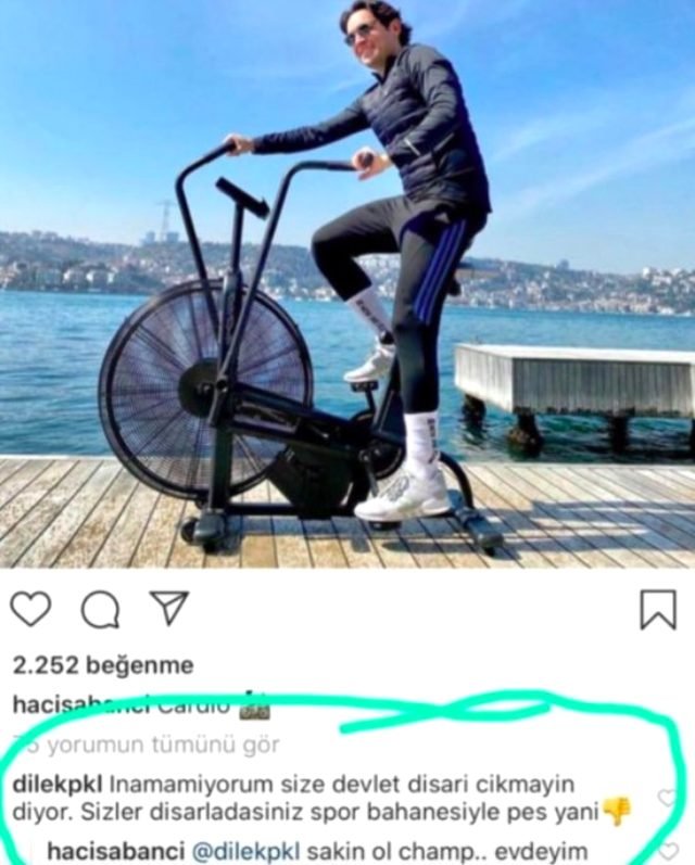 Yalısında spor keyfini sürdüren Sabancı’nın paylaştığı denize sıfır fotoğrafa bir takipçisinden, “Evde kal” yorumu gelmişti. Bu yoruma yanıt veren Sabancı, “Sakin ol champ… Evimdeyim” ifadelerini kullanarak herkesi sosyal medyada gündeme gelmişti.