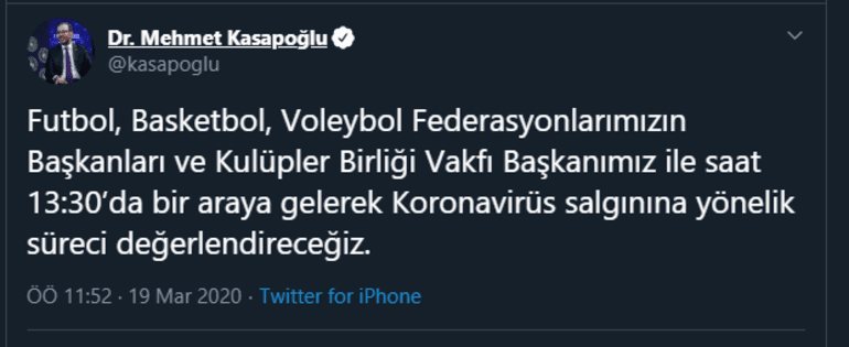 Herkes liglerin ertelenecek mi sorusunu sorarken bugün Türkiye Futbol Federasyonu Başkanı Nihat Özdemir, Türkiye Basketbol Federasyonu Başkanı Hidayet Türkoğlu , Türkiye Voleybol Federasyonu Başkanı Akif Üstündağ ve Kulüpler Birliği Başkanı Mehmet Sepil bugün saat 13:30’da Ankara’da Gençlik ve Spor Bakanı Mehmet Muharrem Kasapoğlu başkanlığında bir araya geliyor.