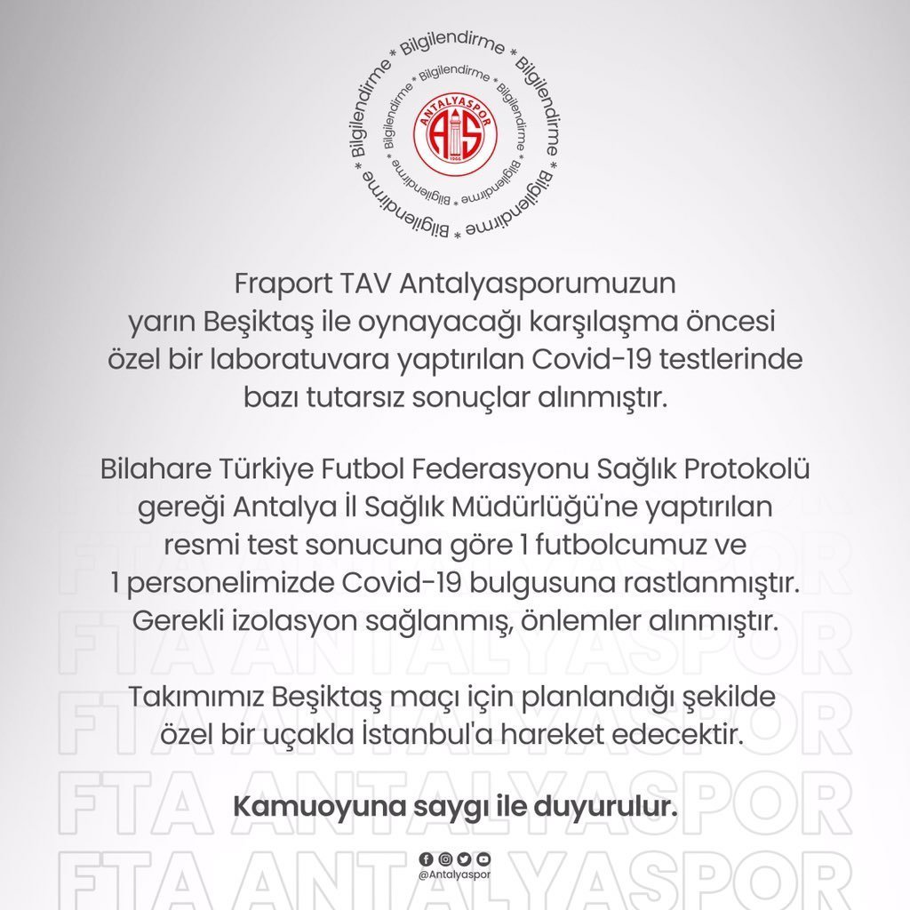 Bilahare Türkiye Futbol Federasyonu Sağlık Protokolü gereği Antalya İl Sağlık Müdürlüğü’ne yaptırılan resmi test sonucuna göre 1 futbolcumuz ve 1 personelimizde Covid-19 bulgusuna rastlanmıştır. Gerekli izolasyon sağlanmış, önlemler alınmıştır.