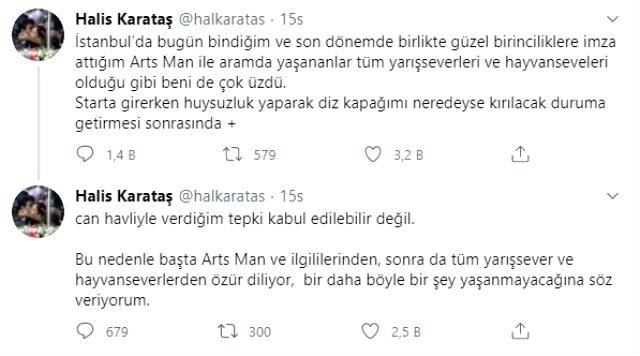 Karataş, kişisel sosyal medya hesabı üzerinden yaptığı paylaşımda “İstanbul’da bugün bindiğim ve son dönemde birlikte güzel birinciliklere imza attığım Arts Man ile aramda yaşananlar tüm yarışseverleri ve hayvanseveleri olduğu gibi beni de çok üzdü. Starta girerken huysuzluk yaparak diz kapağımı neredeyse kırılacak duruma getirmesi sonrasında can havliyle verdiğim tepki kabul edilebilir değil. Bu nedenle başta Arts Man ve ilgililerinden, sonra da tüm yarışsever ve hayvanseverlerden özür diliyor, bir daha böyle bir şey yaşanmayacağına söz veriyorum” dedi.