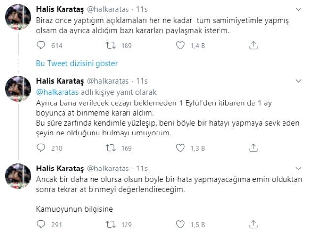 Karataş, yaptığı açıklamanın devamında “Biraz önce yaptığım açıklamaları her ne kadartüm samimiyetimle yapmış olsam da ayrıca aldığım bazı kararları paylaşmak isterim. Ayrıca bana verilecek cezayı beklemeden 1 Eylül’den itibaren de 1 ay boyunca at binmeme kararı aldım. Bu süre zarfında kendimle yüzleşip, beni böyle bir hatayı yapmaya sevk eden şeyin ne olduğunu bulmayı umuyorum” ifadeleriyle yarışlara 1 ay ara verdiğini duyurdu.