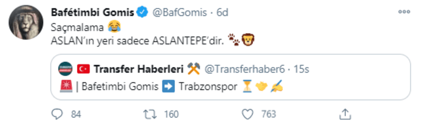 35 yaşındaki Fransız golcü, sosyal medya hesabından “Saçmalama, ASLAN’ın yeri sadece ASLANTEPE’dir” paylaşımını yaparak iddialara nokta koydu.