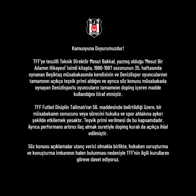 “TFF’ye tescilli Teknik Direktör Mesut Bakkal, yazmış olduğu ‘Mesut Bir Adamın Hikayesi’ isimli kitapta, 1986-1987 sezonunun 35. haftasında oynanan Beşiktaş müsabakasında kendisinin ve Denizlispor oyuncularının tamamının açıkça teşvik primi aldığını ve ayrıca söz konusu müsabakada oynayan Denizlisporlu oyuncuların tamamının doping içeren madde kullandığını itiraf etmiştir. TFF Futbol Disiplin Talimatı’nın 56. maddesinde belirtildiği üzere, bir müsabakanın sonucunu veya sürecini hukuka ve spor ahlakına aykırı şekilde etkilemek yasaktır. Teşvik primi verilmesi de bu kapsamdadır. Ayrıca performans artırıcı ilaç almak suretiyle doping kuralı da açıkça ihlal edilmiştir. Söz konusu açıklamalar utanç verici olmakla birlikte, hukuken soruşturma ve kovuşturma imkanının halen bulunması nedeniyle TFF’nin ilgili kurullarını göreve davet ediyoruz.