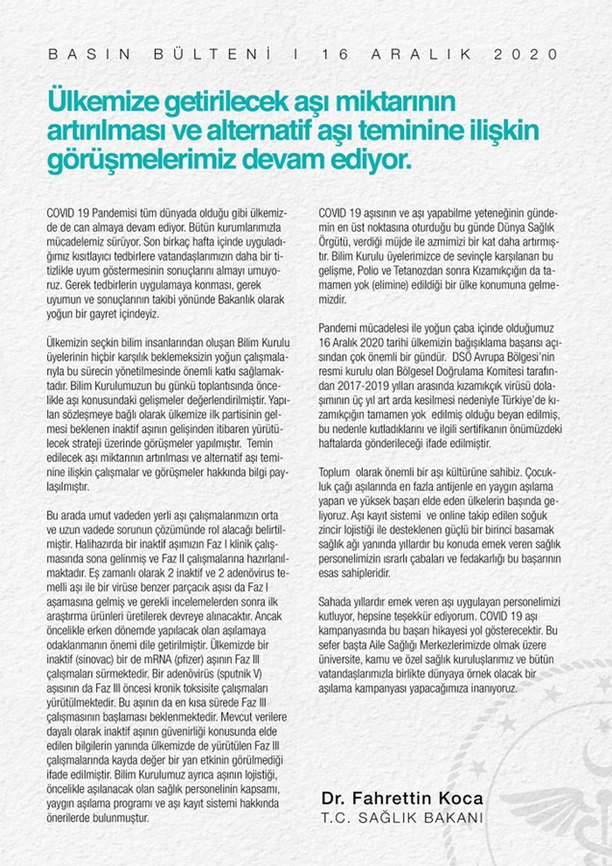 *COVID-19 aşı hazırlıklarının en yoğun olduğu bir dönemde DSÖ tarafından aşı ile önlenen hastalıklardan kızamıkçık hastalığının elimine edildiği ülke olma müjdesini aldık. Aynı başarıyı COVID-19 mücadelesinde de gösterme kararlılığındayız.