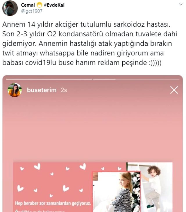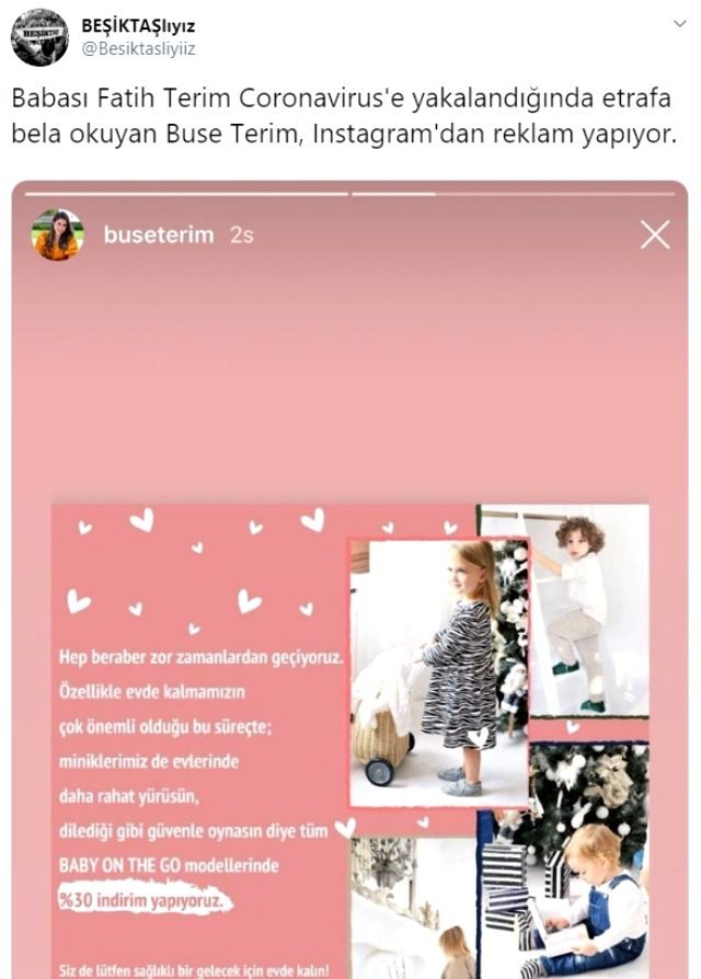 Fatih Terim’in kızı Buse Terim Bahçekapılı, Instagram hesabından yaptığı reklam paylaşımı nedeniyle topa tutuldu. 23 Mart Pazartesi gününden bu yana özel bir hastanede koronavirüs tedavisi gören babasının sağlık durumunu açıklayan Buse Terim, daha sonrasında ise sosyal medya hesabından kendi alışveriş sitesinin reklamını yaptı. Sosyal medya kullanıcıları da bu paylaşım sonrası Terim’i yerden yere vurdu. Twitter kullanıcıları “Millet can derdinde Buse Terim reklam peşinde” sözleriyle Buse Terim’i eleştirdi.