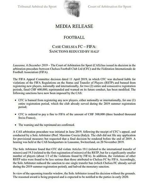 Uluslararası Spor Tahkim Mahkemesi (CAS), Chelsea’nin transfer yasağını kaldırdı. Böylelikle İngiliz ekibinin Ocak ayı için transfer tahtası açılmış oldu.