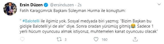 TRT Stadyum’un sunucusu Ersin Düzen, sosyal medya hesabından yaptığı paylaşımda Süleyman Hurma ile iletişime geçtiğini ve başkanın kendisine “Balotelli ile ilgimiz yok. Sosyal medyada biri yazmış; ‘Bizim Başkan bu gidişle Balotelli’yi de alır’ diye. Sonra oradan yürümüş gitmiş. Sadece 1 yerli hücum oyuncusu almak istiyoruz, muhtemelen kanat oyuncusu olacak” sözlerini söylediğini belirtti.